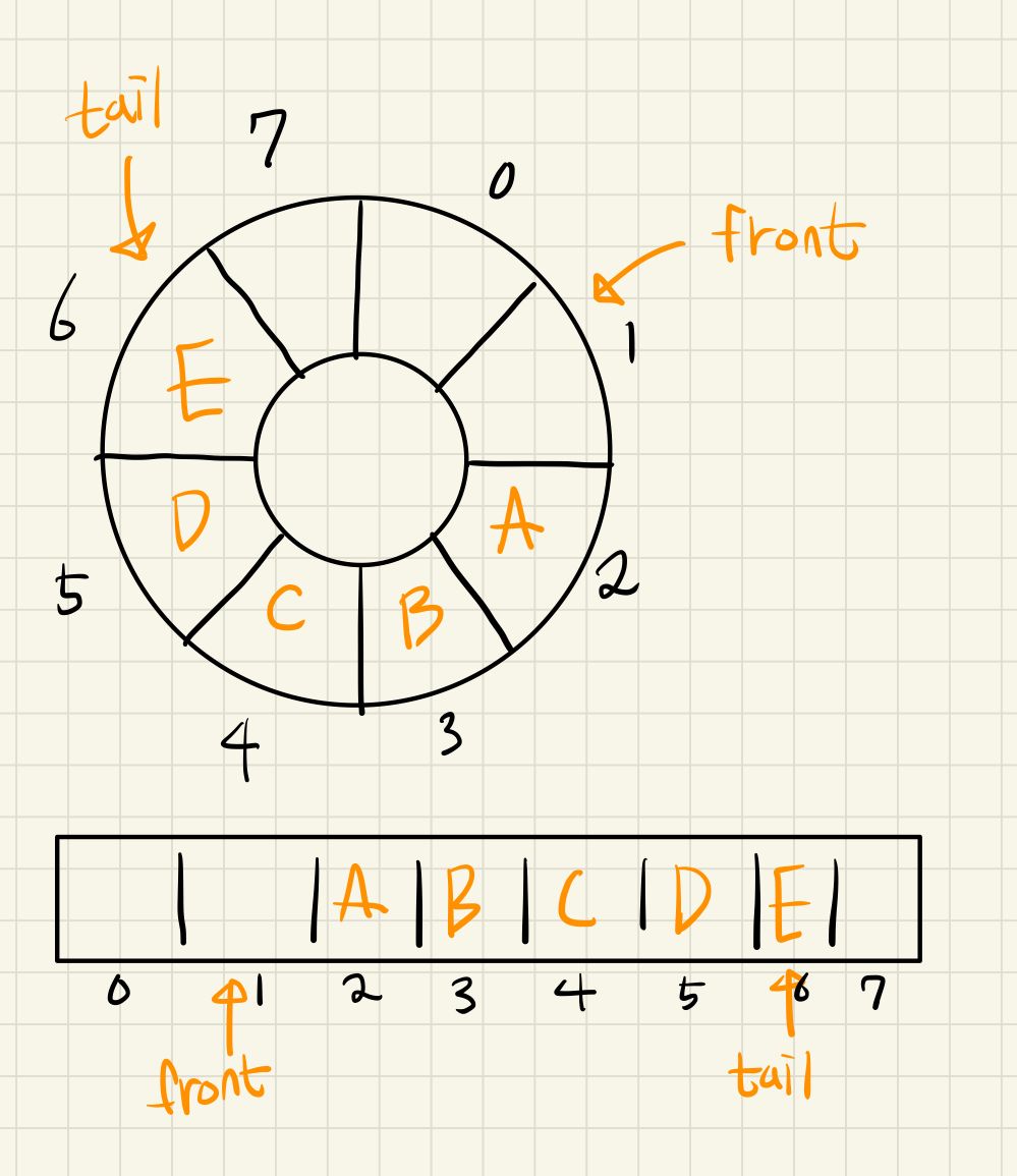 front와 tail의 값이 시계방향으로 돌면서 마치 원형의 배열에 넣는 것 같이 사용됩니다.