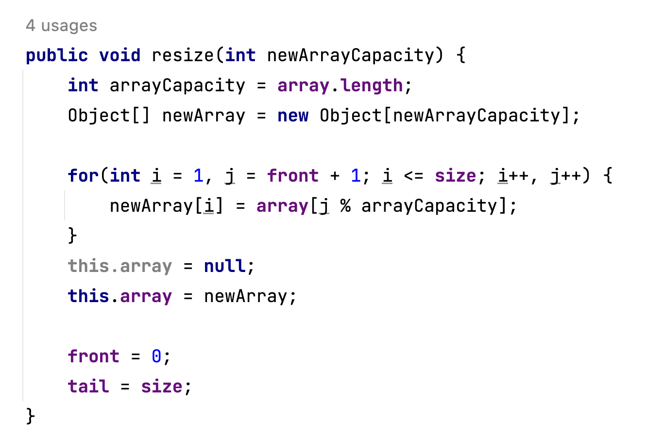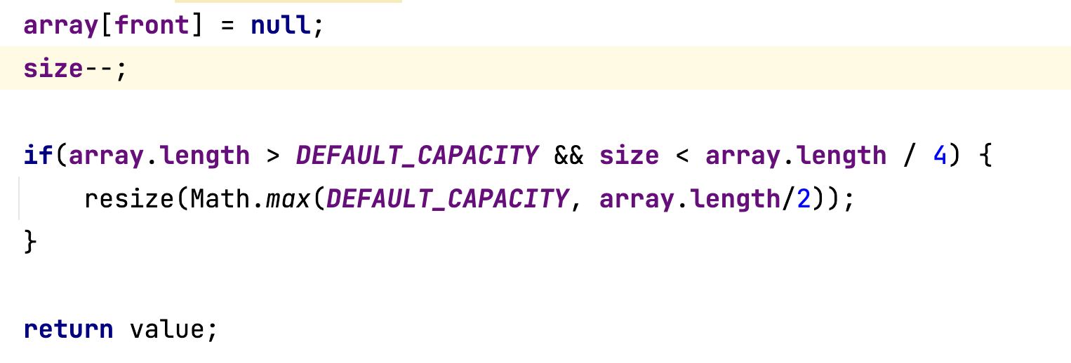 size == array.length로 resize() 조건을 검사하면 공백을 보장받을 수 없습니다.