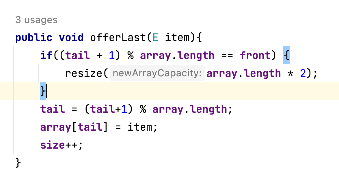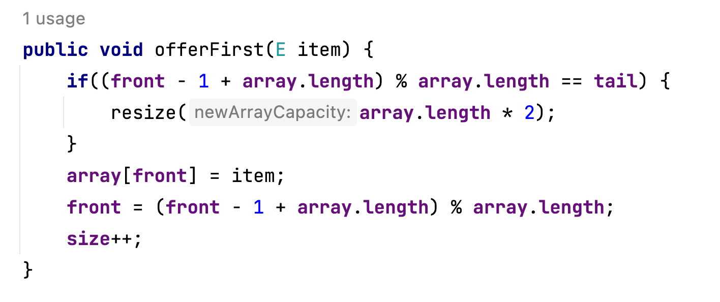 offerFirst()와 같이 용량체크를 하며 이번에는 "(tail + 1) % array.length" 로직으로 시계방향으로 이동합니다.